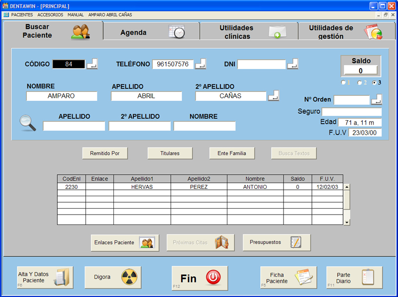 En esta pantalla podremos hacer una búsqueda de un paciente para poder realizar cualquier acción sobre él, como crear un